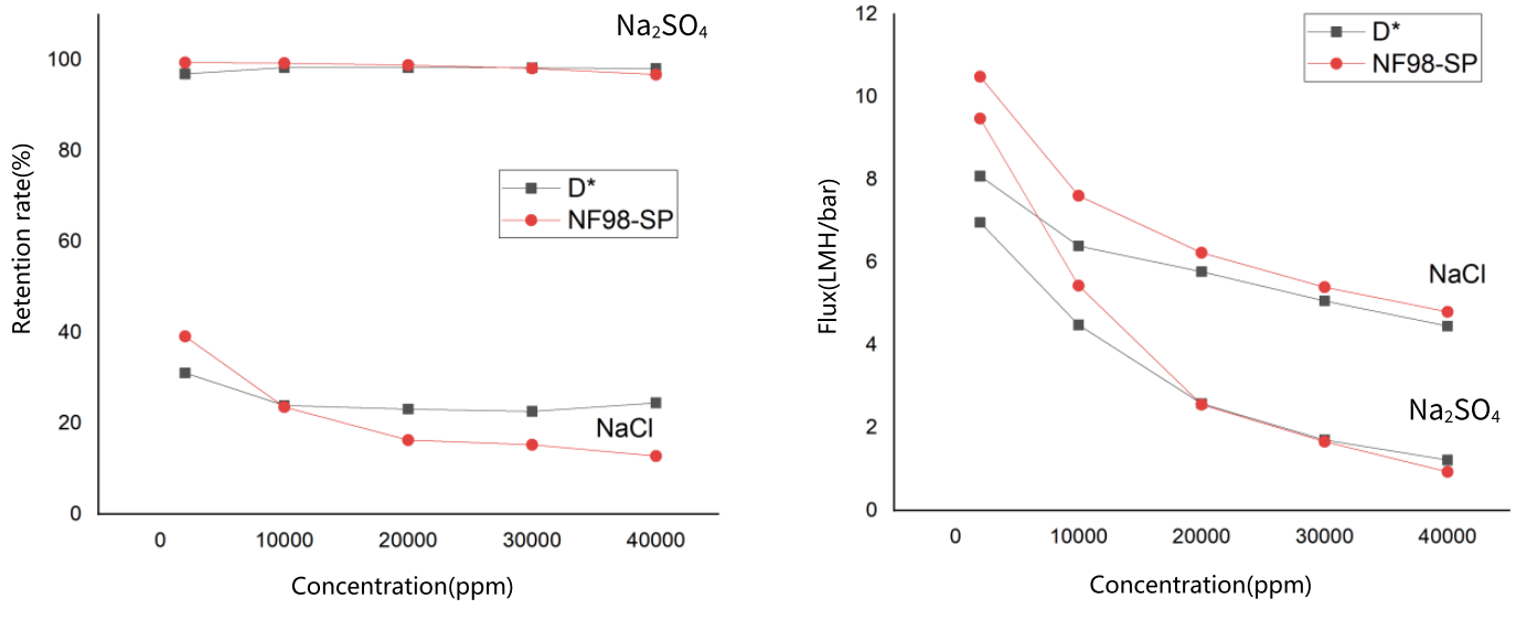 The performance of NF98 series nanofiltration membrane directly replaces or even exceeds that of the mainstream imported membrane products, which can not only meet the Dunan effect with high selective retention of ions (FlG.4), but also desalting and COD removal performance can be differentiated accordina to the actual needs of customers. (Detailed cases and membrane products are welcome to consut senior pre-sales engineers).